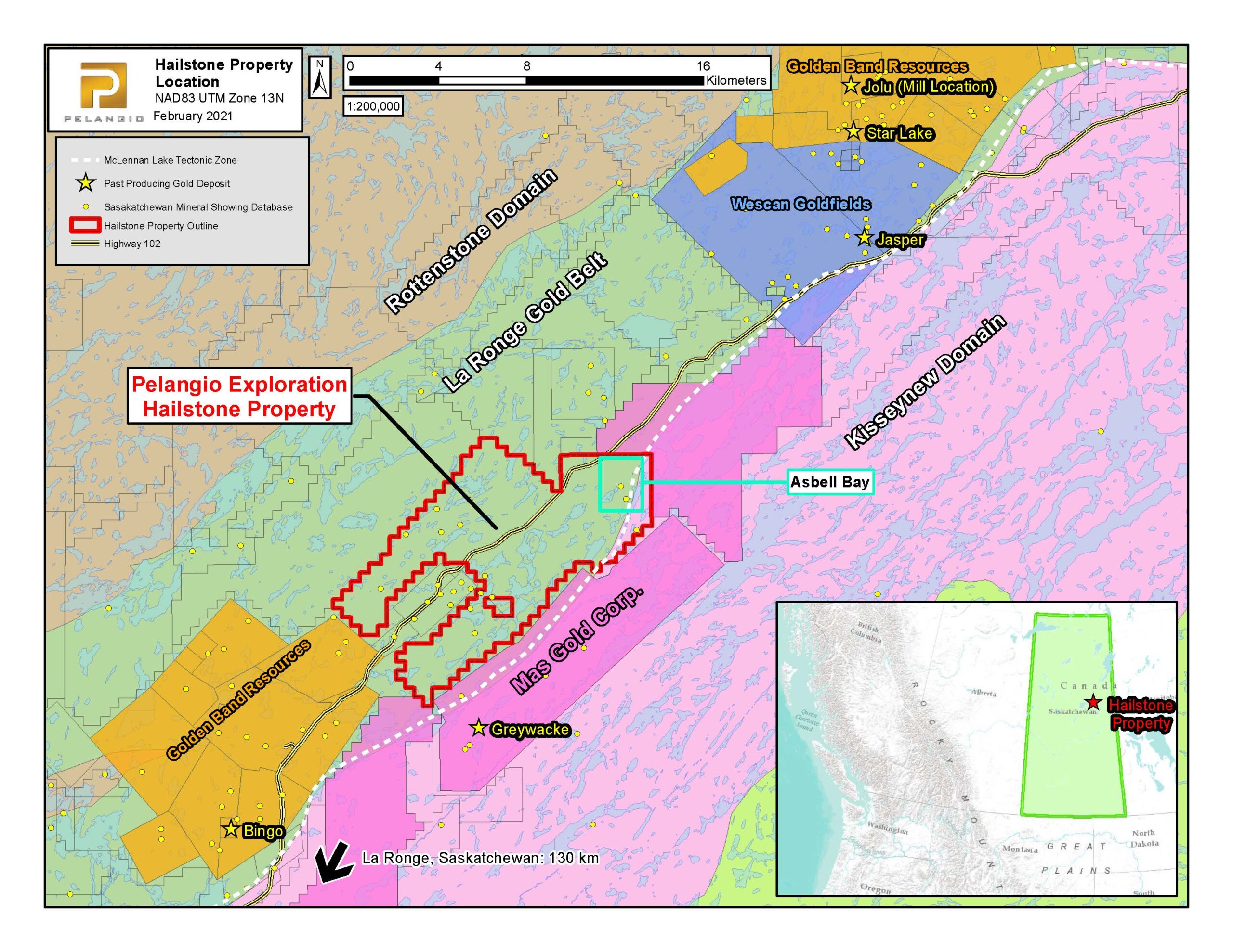 The 75 square kilometer property is located within the Central Metavolcanic Belt of the La Ronge Domain of north-central Saskatchewan, which represents a portion of the Paleoproterozoic Trans-Hudson Orogeny. The property comprises a southwest-northeast trending metavolcanic succession intruded by multi-phase intrusive rocks of the Berven Lake Pluton. Gold and copper (“Cu”) mineralization on the property is hosted within quartz veins and quartz-rich pegmatite dikes associated with southwest-northeast trending shear zones subsidiary to the terrane-bounding McLennan Lake Tectonic Zone. The Hailstone property is surrounded by a number of historical gold mines and occurrences (see Figure 1) in geological environments similar to that at Hailstone.