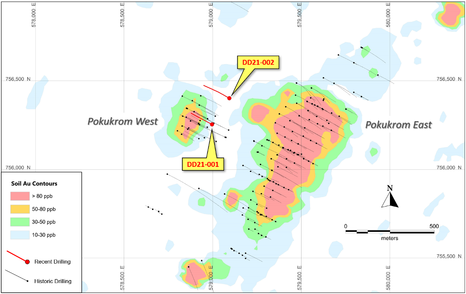 Two diamond drill holes were completed at Pokukrom West for a total of 383.2 meters. The first hole, DD21-001, was completed to a depth of 151.5 meters and was drilled in the middle of previous drill holes to provide information on the structural controls of the high-grade mineralization at Pokukrom West by way of core orientation and detailed structural logging. The analysis and interpretation of this data is underway. Drill hole DD21-001 returned an intercept of 3.81 g/t gold over 15 meters including 5.65 g/t gold over 7 meters, comparable to or better than adjacent historic drill hole intercepts. The second hole, DD21-002, was drilled to a depth of 231.7 meters and was designed to test down-plunge of the known Pokukrom West mineralized lode which appeared to be limited in extent by surrounding weak drill intercepts apparently cutting off a potential down-dip and down-plunge continuation of the mineralization. Hole DD21-002 effectively discovered a new lode of gold mineralization approximately 175 meters down-plunge of the known Pokukrom West lode, returning 3.19 g/t gold over 12 meters including 6.85 g/t gold over 3 meters, open ended further down-plunge, down-dip and along strike to the north. The high grade Pokukrom West mineralization is also open on strike to the south, at least to shallow depths. Refer to Figures 1 and 2 and to Table 1 which lists the drill hole details and significant gold intercepts.