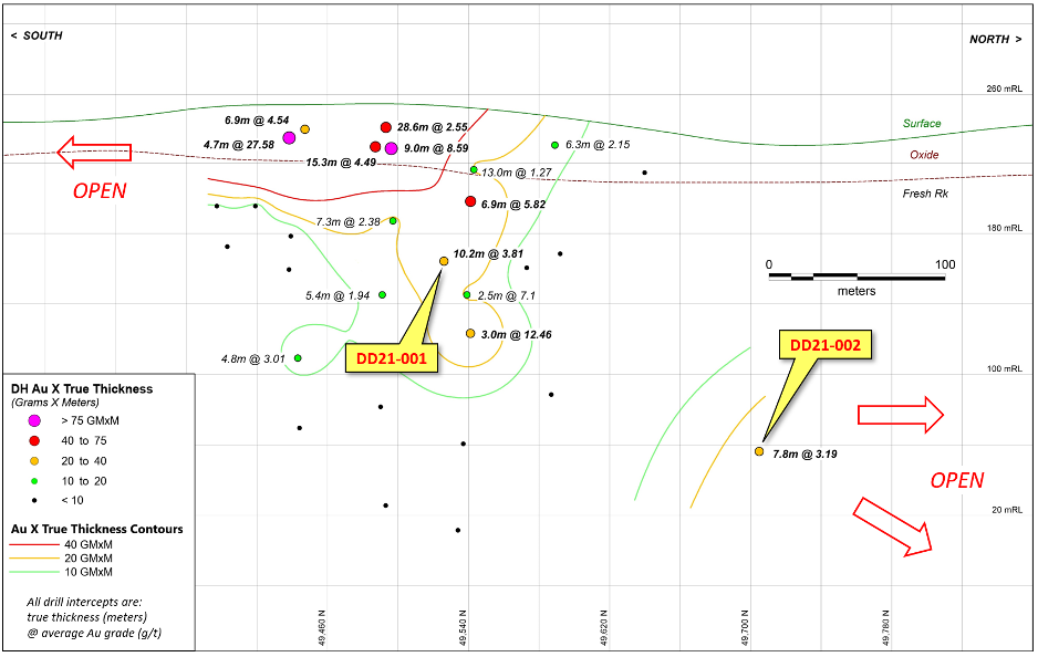 The true thicknesses of the two mineralized drill intercepts reported here are approximately 70% of the drill core length for hole DD21-001 and 65% of core length for hole DD21-002, which were utilized in the creation of an updated vertical longitudinal drill section (Figure 2) of previous and current drill intersections into the Pokukrom West mineralization.