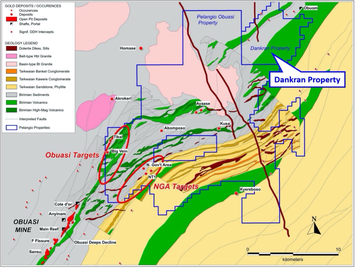 The Dankran property is a 34.65 km² Prospecting License optioned by Pelangio Exploration from BNT Resources Ghana Ltd. in November 2020 and is contiguous to the northeastern corner of Pelangio’s Obuasi project. The Dankran property is adjacent to and on strike with the historic Obuom Mine which produced 29,000 ounces of gold at an average grade of 16 g/t Au from underground workings in the 1930’s. The property covers nearly seven kilometers of strike of highly prospective geology and regional structures along the western flank of the Ashanti Belt, 20 kilometers (“km”) to the northeast of AngloGold Ashanti’s top-tier Obuasi Mine. Refer to Figure 1.
