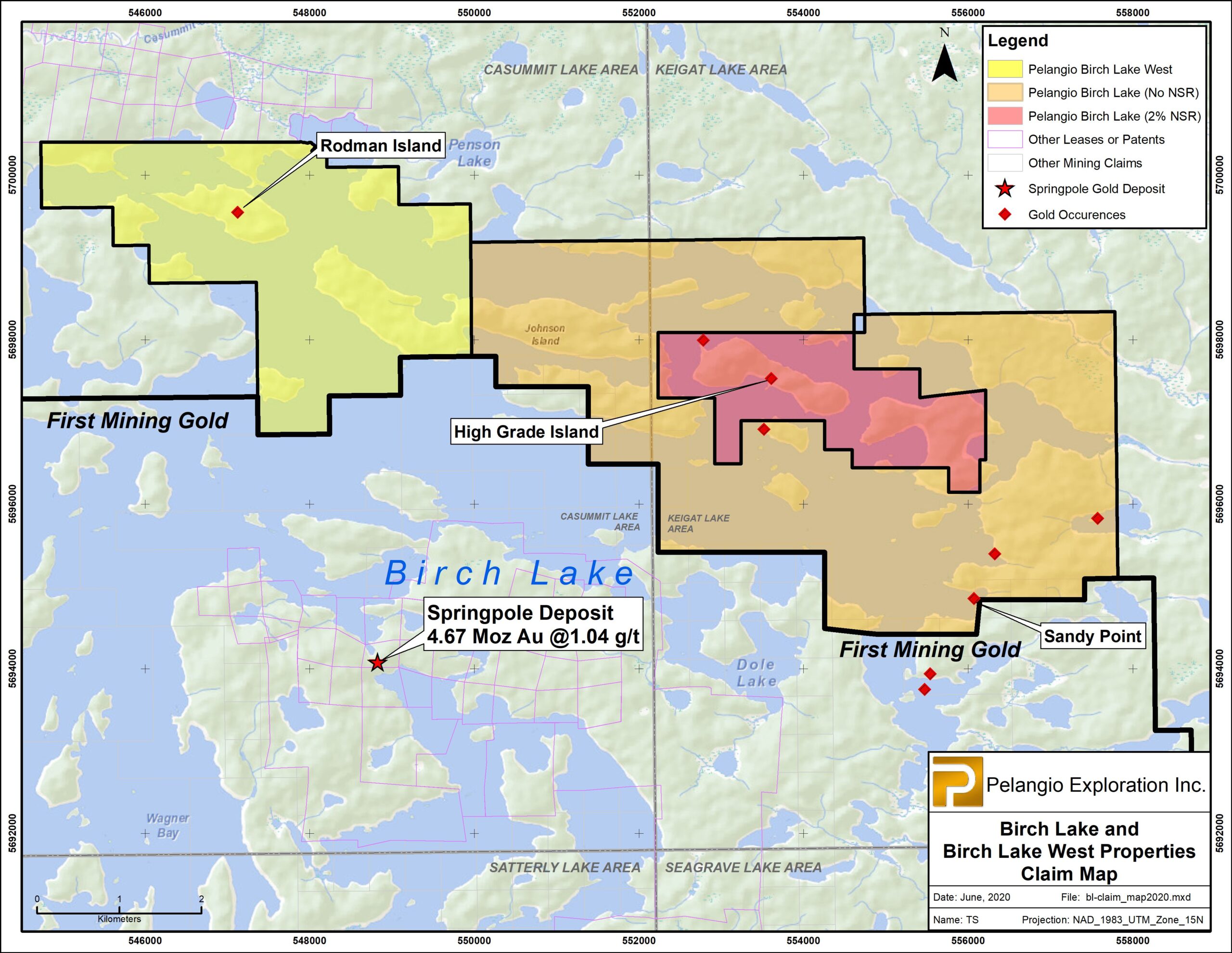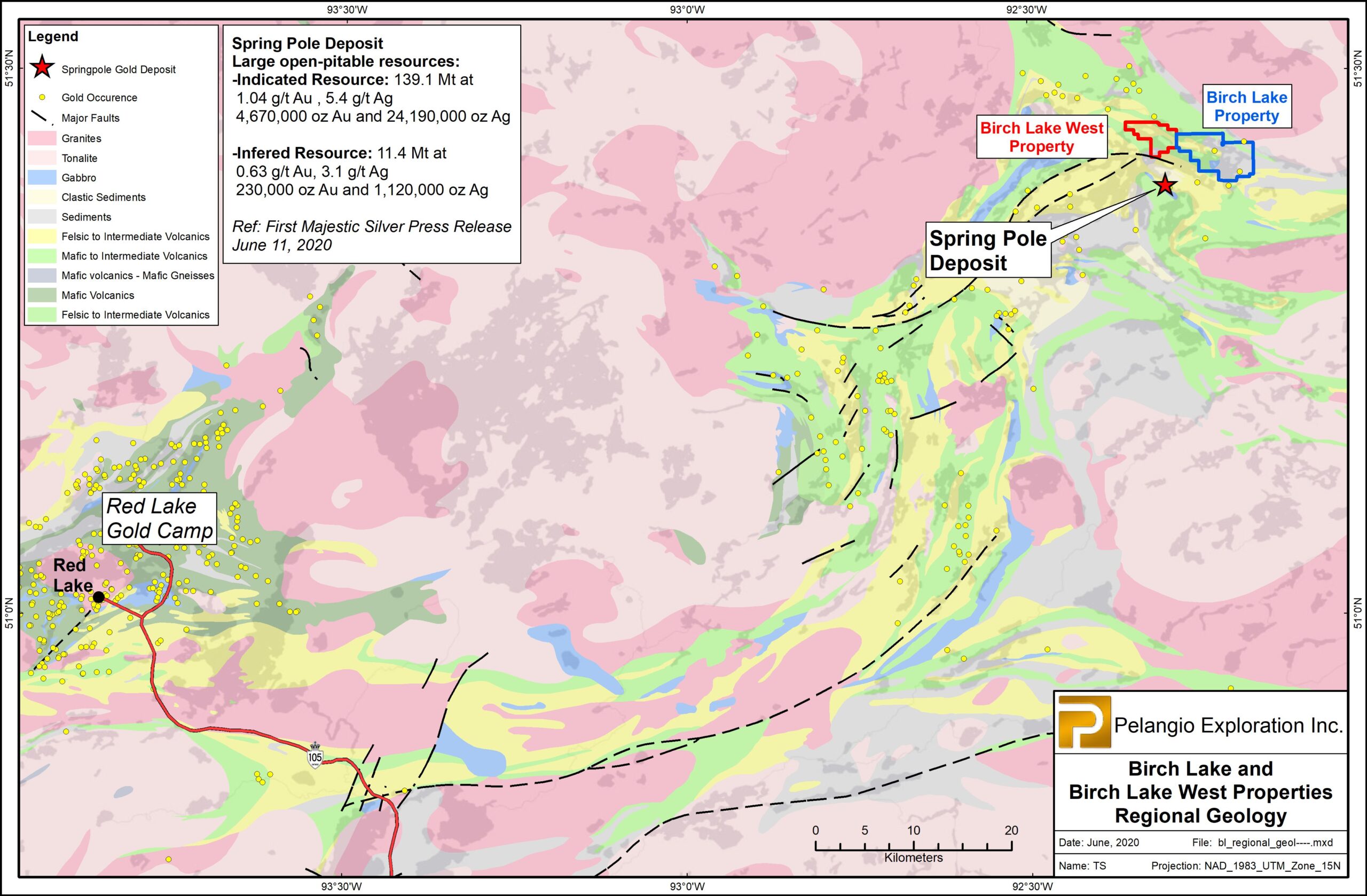In the Birch Lake area, Pelangio’s land holding consists of the BLP (23.6 km2), now under option to Jubilee Minerals, and its Birch Lake West Property (10.4 km2) contiguous and immediately west of the BLP. These properties are located 110 km northeast of town of Red Lake, Ontario in the Birch Uchi Greenstone Belt. The BLP is contiguous with First Mining Gold’s property which hosts the 4.67 million ounce Springpole Deposit (Reference: First Mining Gold PR June 11, 2020). More specifically, the BLP boundary is located approximately 3200 meters (“m”) north of the actual deposit. Renewed interest in First Mining Gold’s Springpole project is anticipated to generate exploration interest for junior exploration companies with established, prospective large-scale land holdings in this emerging new exploration camp. (see Map 2)